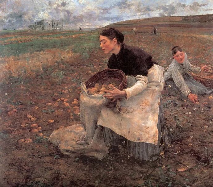 《收获土豆》是勒帕热的另一幅代表作品,画中描绘了一位农家妇女正在田野里躬身收获土豆的情景。通过对乡村生活的客观还原和朴素描绘,在求其“真实”的同时,勒帕热也将其个人情感在朴素的描绘中自然地流露出来。在这幅画中,勒帕热把对农民和农村生活的情感隐藏在描绘农村最普通的乡村劳动——“收土豆”这一情境中,普通的日常生活加之朴素的描绘,情境蕴藏情感于不动声色之中,在画面白描般手法的道白中,引起观者一缕乡愁、一丝回味以及深深的思考。由于长期生活在农村,勒帕热对农民和乡村生活有独到而深刻的体验,所以他能以极其敏锐和细微目光把握住乡村农民特有的动势和表情,从而深刻地揭示人物的个性和内心活动。从这张画中我们可以看到,现实主义和自然主义对“真实”的理解和表现不尽相同。现实主义是以反映现实为目的,而自然主义则是努力挖掘现实中所蕴含的“真”,这个“真”就是自然主义所追求的本质,是自然主义的生命。勒帕热的乡土绘画以一种凝固的自然化的生活情境,表达了一种朴素的、沉静的力量,使观众在一下子就融入到画面的情境中,似不动声色,却又被画面自然融汇,引起观众潜在的、普遍的人性情感的共鸣,这也正是勒帕热绘画的魅力所在。