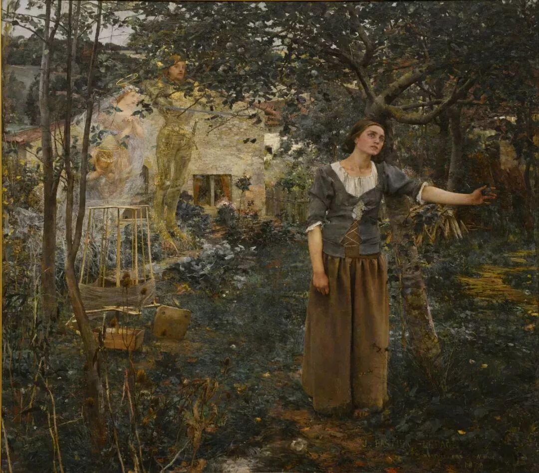 《圣女贞德》创作于1879年,这幅画颇具新古典主义借古喻今的精神内涵。此画借描绘圣女贞德的典故号召人们对侵略者坚强抵抗,重新夺回失去的土地。勒帕热在此画中并没有把贞德描绘成一个传奇色彩的英雄人物,而是刻画了一个站在农场中的农家女子,虽是历史题材,但仍失不自然主义的风貌。勒帕热意在用历史典故去挖掘乡土题材的可能性,此画更强调了自然主义绘画的社会功能。