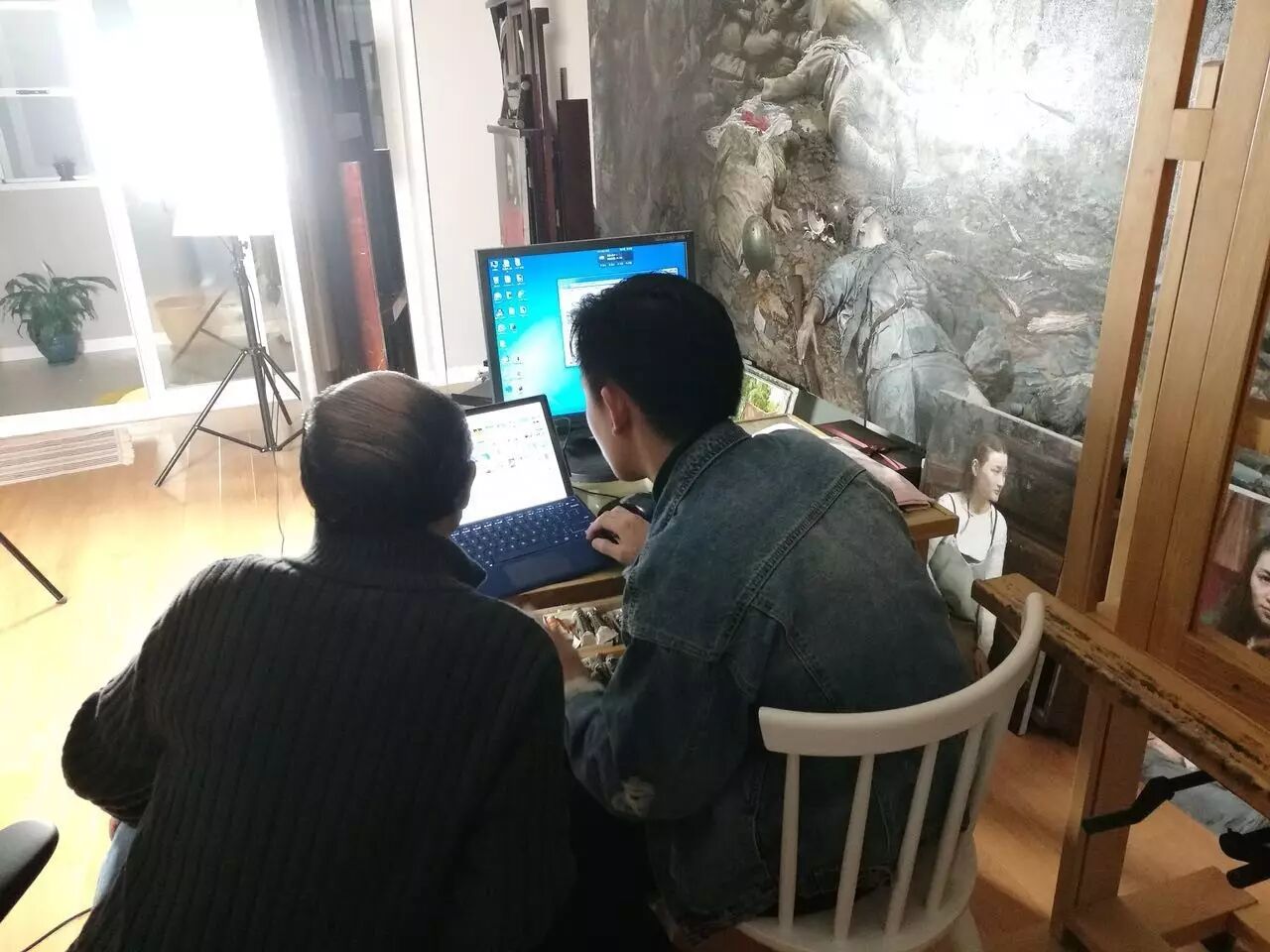 徐芒耀老师为准备本次讲座精心准备演讲稿,并与上海青年写实绘画沙龙工作人员陈嘉豪在工作室进行本次讲座的资料整备工作。
