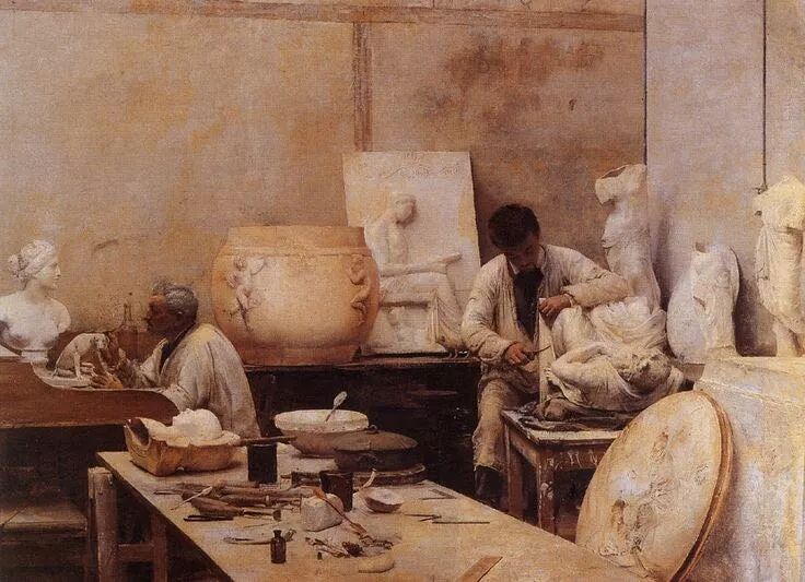 纵观西方绘画,人体应该是最重要的叙事载体,艺术家常用人体造型来表达叙事的观念。从16世纪以来传承几百年的学院教学模式就是围绕着训练艺术家对于人物造型的理解与驾驭,以及这些造型如何在历史、圣经题材创作中进行艺术叙事而展开的。人体也是丹坦众多作品中主要的描绘对象,但他对人体造型的运用和德拉罗什(Hippolyte-Paul Delaroche 1797-1859)或卡巴奈尔(Alexandre Cabanel,1823-1889)等学院派画家却有所不同。前者画面中的人体只是某一现实场景的真实再现,几乎没有寓意和象征,而后者常运用人体表达神话或宗教故事中的某种蕴意;前者画面不再注重人体的情节魅力,怎样安排人体姿态,组织人体在空间中的关系变得更为重要,而后者则构思如何用独特的人体造型来熨帖地表达主题;前者可以说是倾向于自然主义,而后者明显带有象征主义特点。譬如《真人翻模》(Un moulage sur nature)(1887)中的女人体就是典型的代表。此作品表达的是雕塑工作室中两个雕塑家正在翻模的瞬间,女人体婀娜的姿态轻松优雅,俨然像是古希腊的雕塑造型,但她却不是希腊神话中的某个女神,只是借用古希腊雕塑的人体造型来塑造真实生活中的女模特,她被描绘的栩栩如生,皙白的皮肤透着绯红色,和两个雕塑家构成了支撑整个画面的三角形。三个人物的视线共同汇聚在模特被翻模的前脚上,这里是画面的视觉中心,也是画题之处。这工作室场景想必还是他父亲的雕塑工作室,雕塑家应该是他的父亲和叔叔或助手,画家对这一切是那么的熟悉,以至于工作室中这些杂乱堆满的各种器具和雕塑,被他以自然主义的方式表达得如此微妙而丰富、细腻而真实,宛然是可以走进去的空间场所。