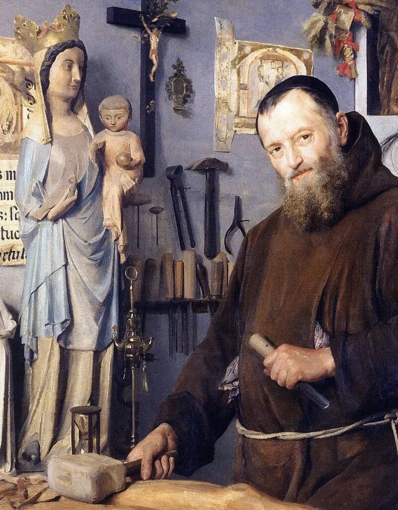 丹坦的艺术创作与他成长的家庭有着密切的联系。丹坦受家庭的影响不仅仅体现在艺术的学习和修养方面,而且也体现在置入他记忆深处的祖父、父亲及叔叔在雕塑工作室工作的情景。起初,丹坦的创作题材主要取材于古典神话或宗教,这也是19世纪学院派最为常见的题材,但这些作品反响平常,后来他以雕塑工作室作为创作主题,画他从小就熟悉的场景,作品面貌鲜明独特,一举成名。在1874年的博览会上,他创作的《作为木雕家的信徒》(A monk as a wood sculptor)入选罗马大奖赛并获得三等勋章,此作品也成为了丹坦艺术生涯的转捩点,从此名誉和声望纷至沓来。《作为木雕家的信徒》描绘一位老年木雕家的工作室场景,这位老木雕家我们完全可以推测人物的原型应该就是其祖父的形象。此画构图均衡饱满,色调沉稳雅致。整体地看画面被分为左右两个部分,左边是木刻的圣母怀抱圣婴,右边是身着深棕色信徒长袍的木雕家,他眼神睿智、坚毅而自信地注视着画外的观众,一手拿锤一手握凿正准备工作。背景的墙上除了挂着各种锤、凿子和铲子等木雕工具,还有研究和设计的草图以及十字架,这些不同质感的物品被他以娴熟的学院派技法刻画得详实而精到。